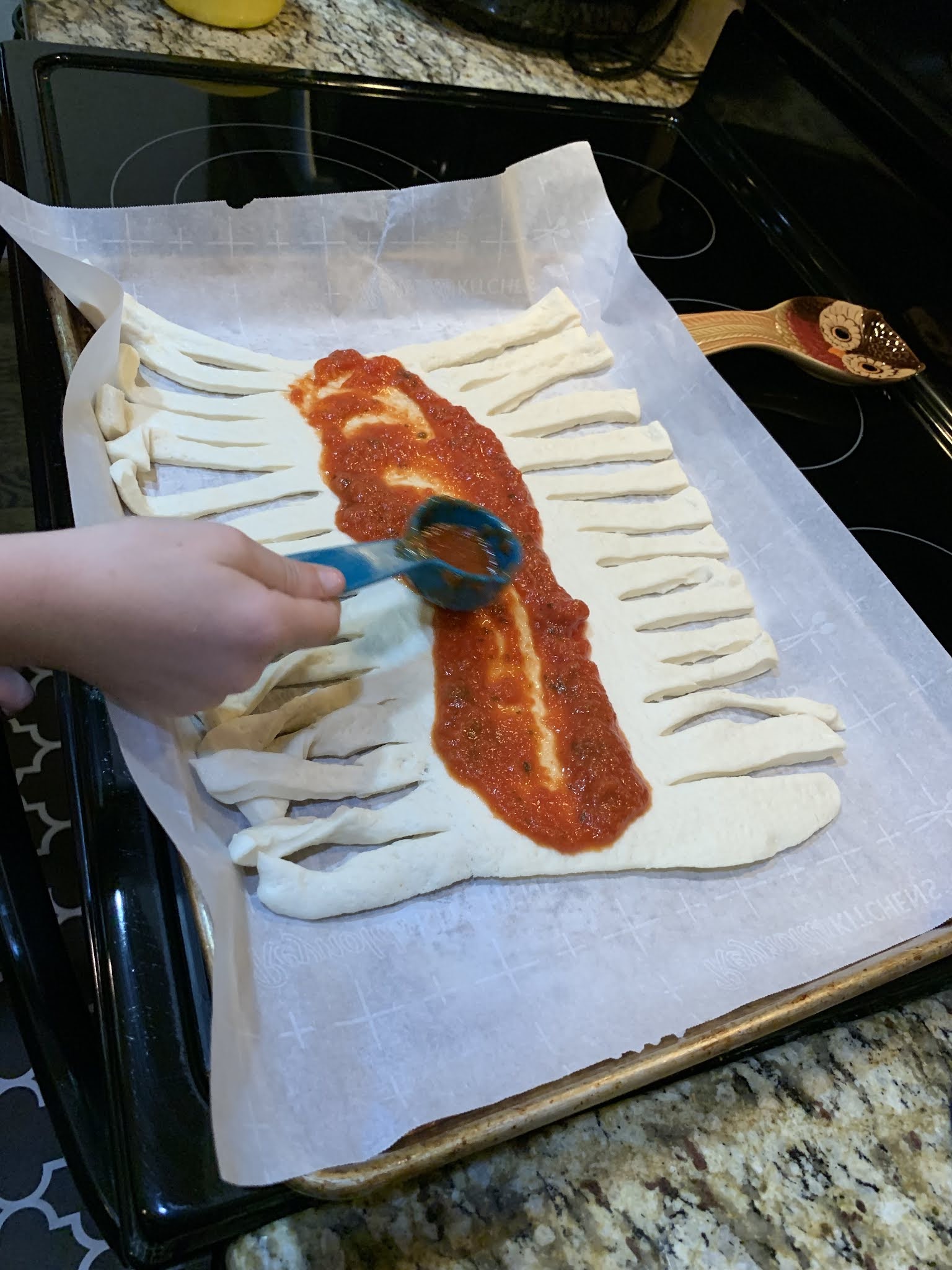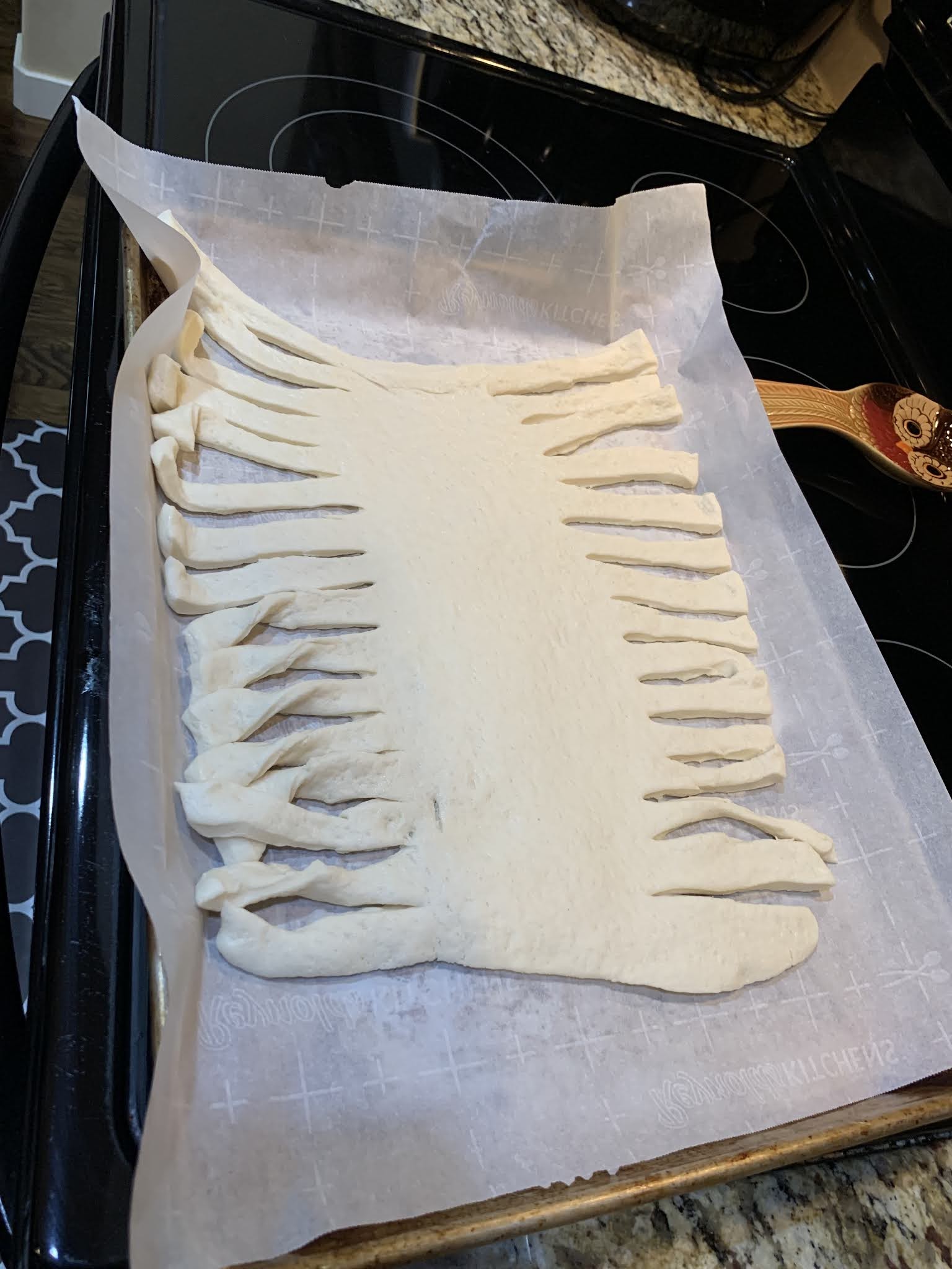 We used scissors to make strips on both sides. We cut 1/3 of the left side and 1/3 of the right side leaving 1/3 intact for the middle where we will put the ingredients.
