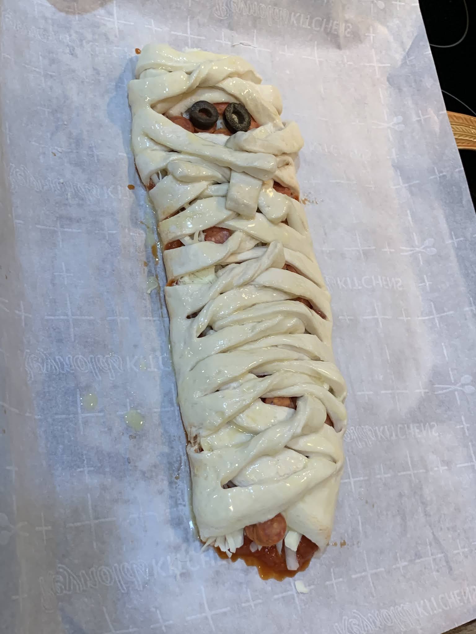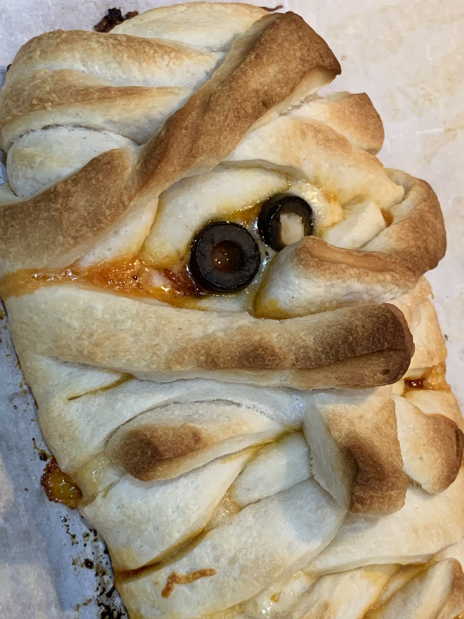 forth from side to side so it looks like mummy cloth. We used two slices of olives for the eyes.