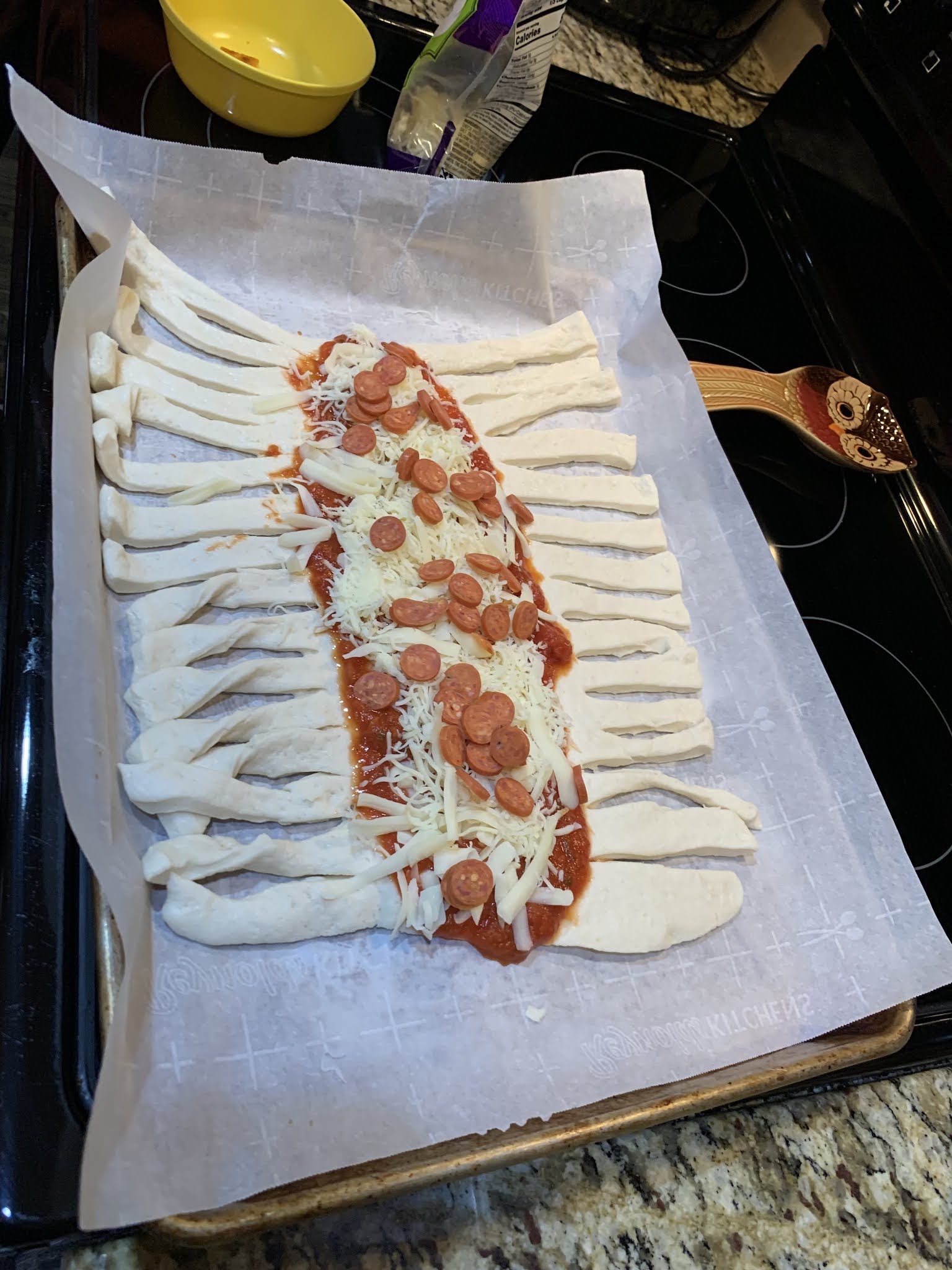 Add some pizza sauce down the middle, layer in your toppings and cover with cheese.