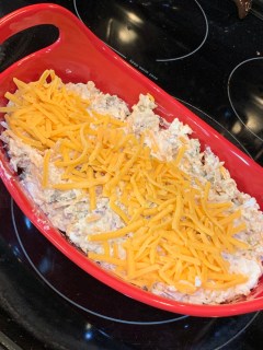 The dip then goes in your favorite baking dish for dips after spraying it with Pam to help it not stick.