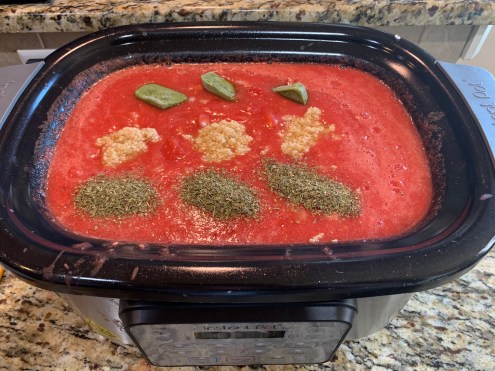 Our kiddos don’t love big chunks of tomatoes in sauce, so I puree tomatoes as well as chop some smaller that will get smaller while simmering away in the crock pot all day long.