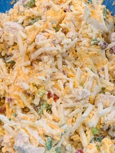 On the first time we made it, I used hashbrowns because I had two partial packages in the freezer that I wanted to use up and we added velvetta because my Father-in-law suggested it and he was helping make it. 🙂 This recipe was a big enough hit that it was requested by my husband that we make it for them to take on the elk hunting trip. We doubled the recipe below and it made 3 large pans. We cooked one the night we made it and froze 2 for the trip.