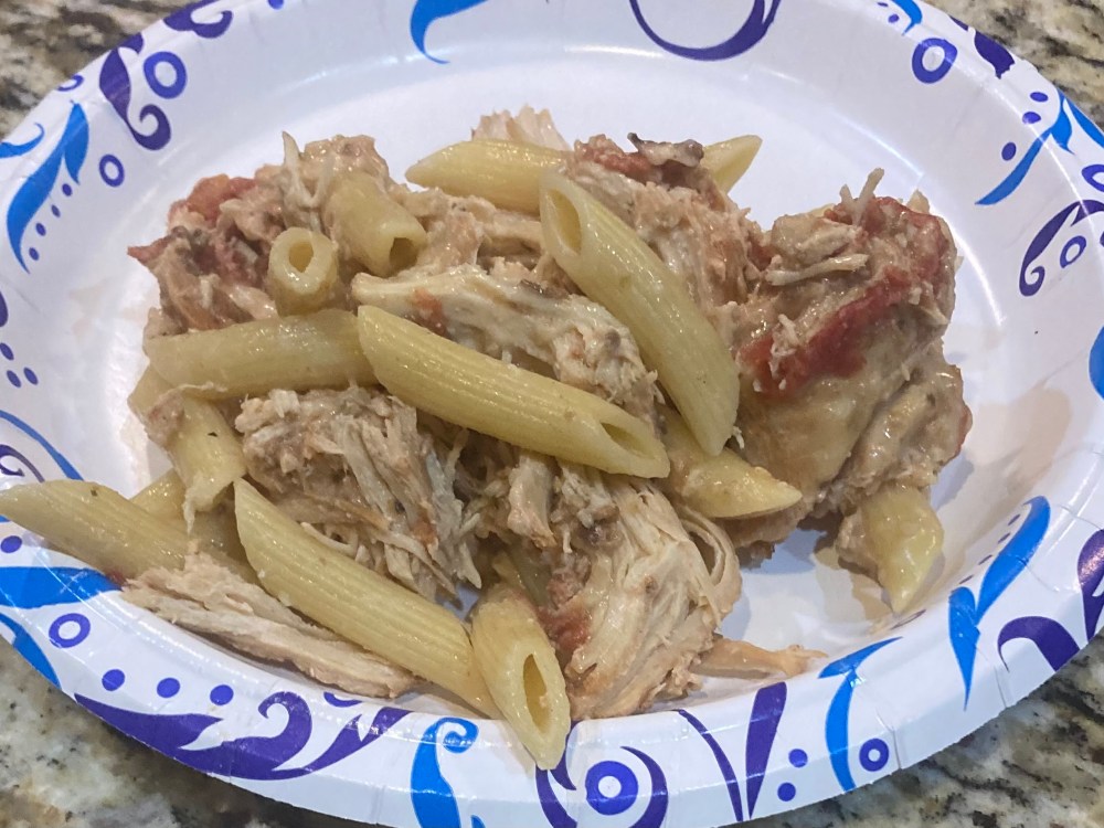 At home my husband made chicken garlic pasta. This is a hearty, comfort food meal that starts out in the crockpot with just a few ingredients. Once that is fully cooked, you add cooked pasta and cheese to the party and it’s ready to go. Thank you to my husband for sending me a picture of his plate. ❤