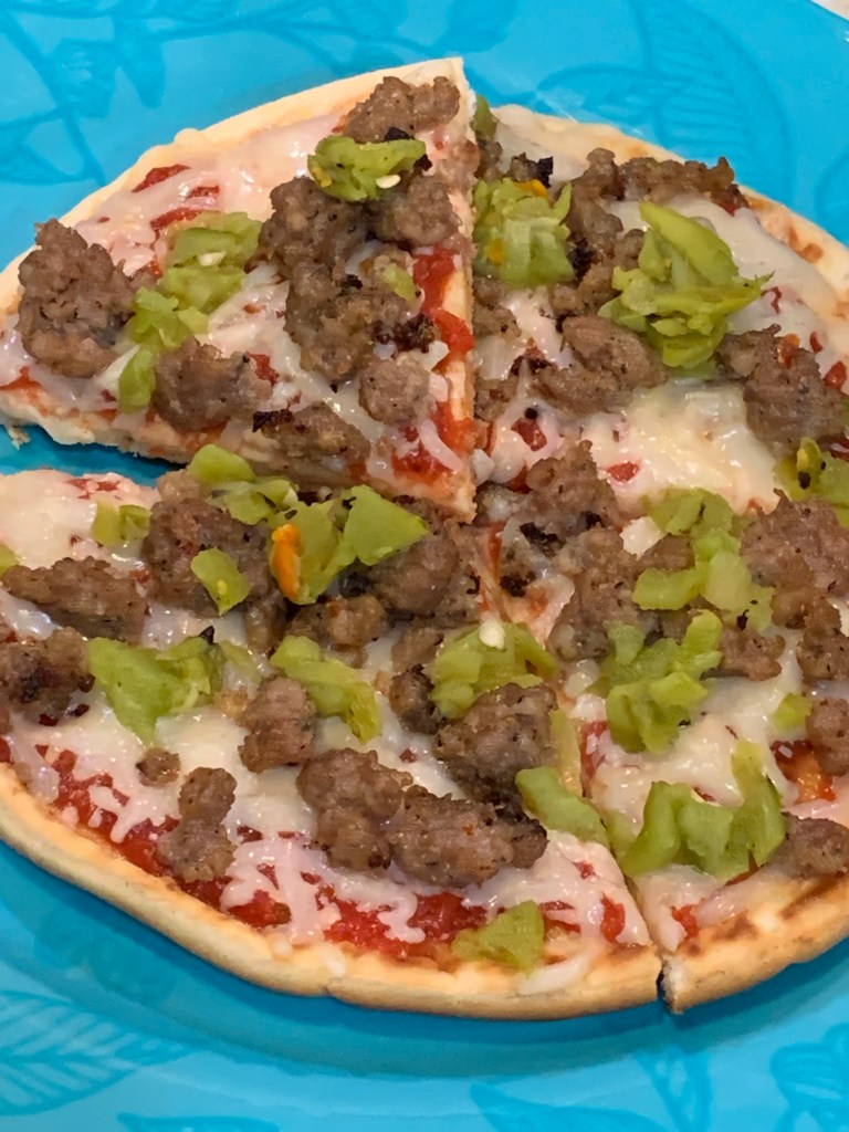 A hidden gem at Costco are packages of 10 or 12 pitas. They are perfect for pita pizzas that can be topped in so many ways. It is a quick way to throw together a quick meal. Sometimes the kids are “all in” with throwing on their toppings but today they were running in different directions and I tossed theirs on. For our toppings – I pulled some precooked sausage out of the freezer. We also had some pepperoni on hand. I wished we had mushrooms but was able to power through without them. A picture of mine is below with sausage and green chile.