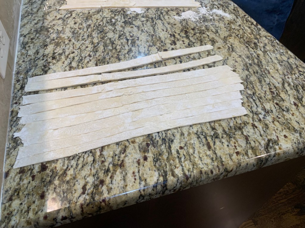 Once the noodles have been flattened with a rolling pin – use a pizza cutter to cut the noodles. Once cut, they will need to dry some so they can hold up to the cooking process. Ours set out for around an hour.