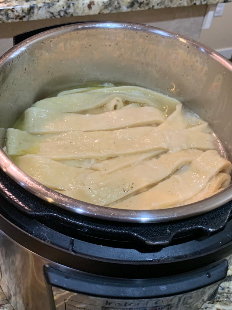 When the noodles are ready, slowly lower them into the instant pot so they stay separated when cooking. Our daughter lowers one at a time and my husband did 3 at a time.