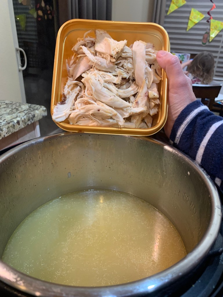 Strain the carrots, celery and onion from the chicken broth and remove the bay leaf. The chicken stock is then ready to go into the instant pot.
