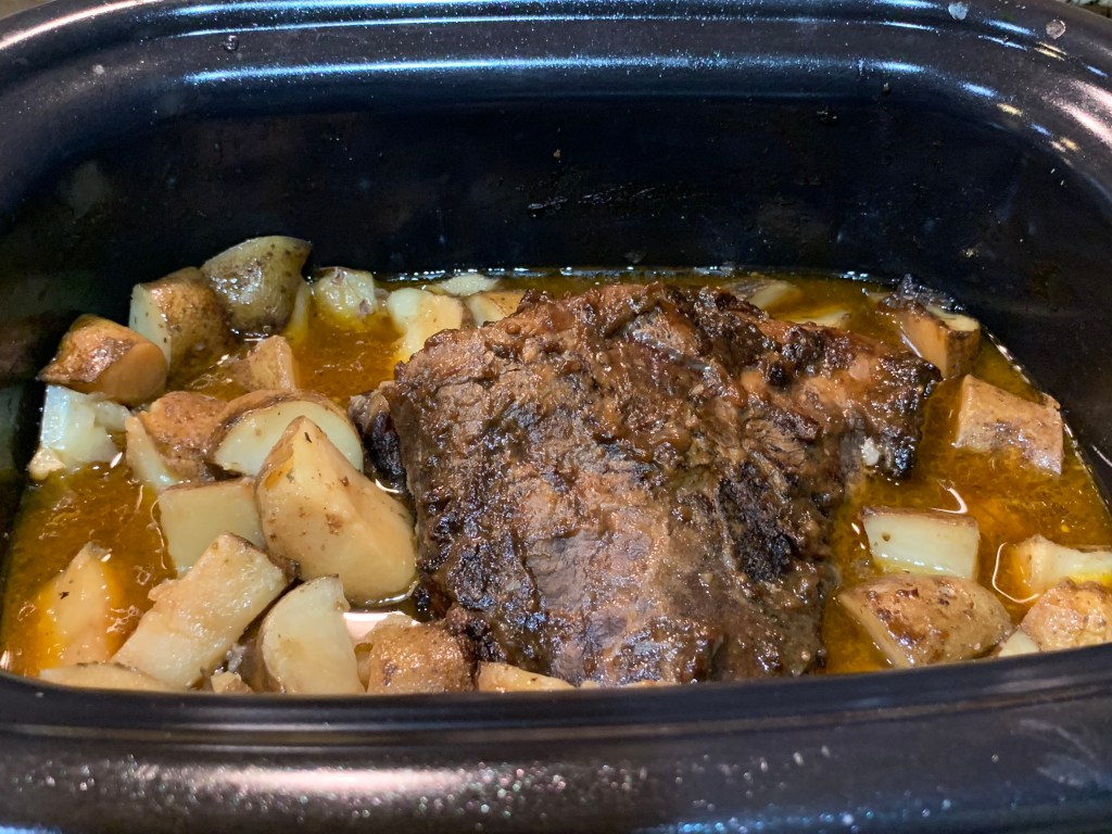 To make life super easy today – I threw the roast in the crockpot by itself with a packet of stew mix on the top and let that simmer alone for the morning and then added chopped potatoes to cook with it for the afternoon.