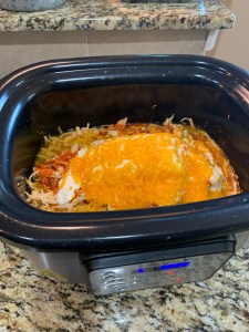 We were celebrating an early Christmas get together after church on and it was perfect to pop the freezer meal in the crockpot before church and then shred up the chicken after. After shredding the chicken – I added the block of cream cheese, cheddar cheese and more wing sauce on top. I put ours in the oven for a bit to give it that baked deliciousness.