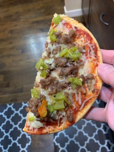 We had some pita bread to use up and thawed sausage in the fridge to cook up. Pizzas are always a dinner win from the kid’s point of view. Here’s a picture of mine.