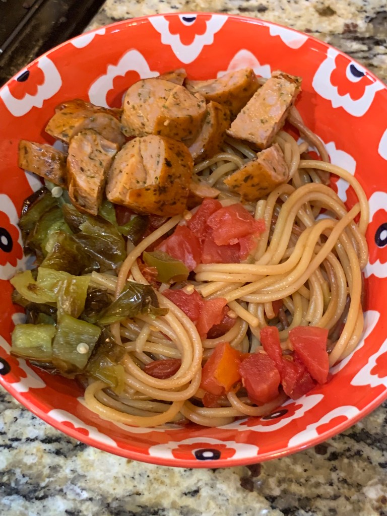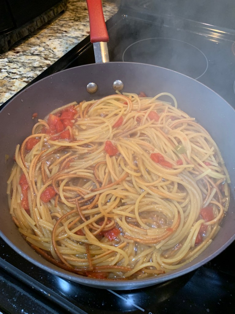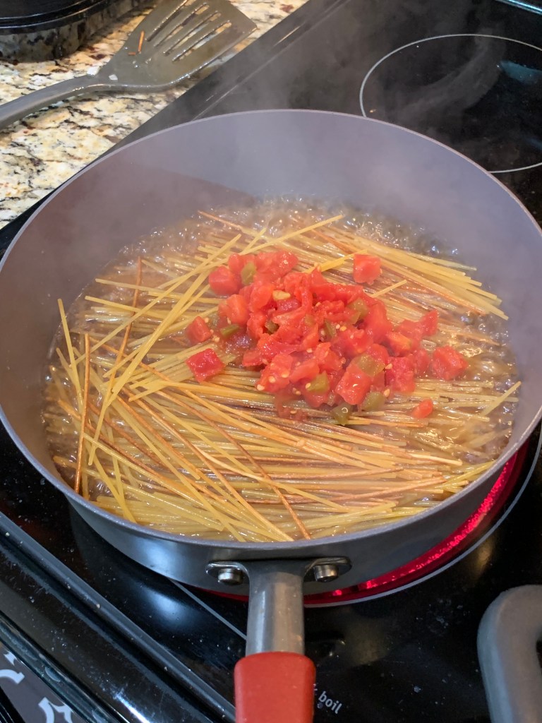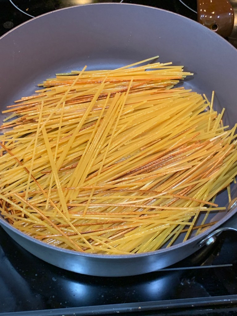 Warm the EVOO over medium heat and add the pasta of your choice. I like to break the spaghetti in half so it fits easier in the skillet.