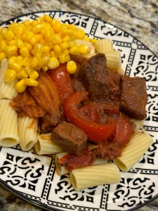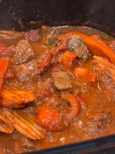Add the stew meat, spices (next four ingredients), diced onions and beef broth to the crockpot and cook on high for 3 hours. I was starting this a little later in the day than I anticipated so I wanted to cook it on high some to give the cook a jumpstart.