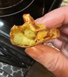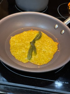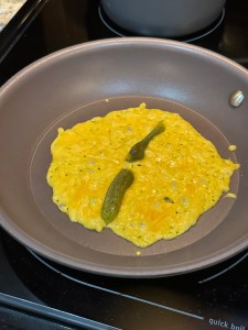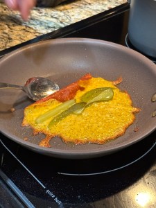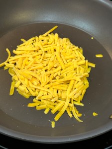 We spread out about 1/3 cup cheddar cheese into an even layer adding pickle strips to the middle and cooked it on medium to medium high heat for 1-2 minutes. The first one cooked a little longer and the next couple cooked faster with the pan being heated up.