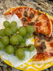 The girls have been wanting pizza and REALLY wanted it tonight, so they had little pita pizzas for dinner with sausage. It worked out great because we had two pitas in the fridge to use that were leftover from the freezer meal session last weekend and some precooked sausage. Quick meal and happiness all around.