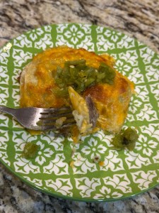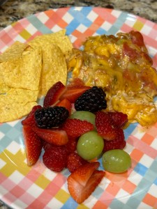 I cooked one of the chicken fajita wraps meals in the crockpot during the day while home with a sick kiddo and then used this recipe for Texas Ranch Chicken Casserole to make dinner using the veggies and cooked meat. My oldest daughter made fruit salad to go with dinner.