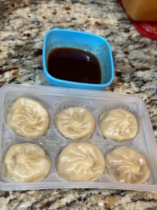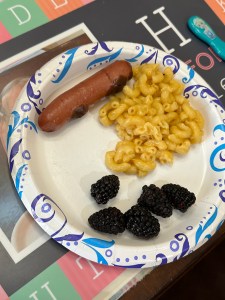 So… during the day our power went off, so the slow cooker turned off and dinner was a bust. The girls had leftover mac and cheese with hotdogs and blackberries. I had some steamed chicken and veggie dumplings from Costco that I have been excited to try and really liked them.