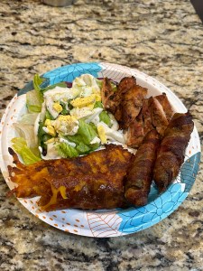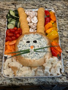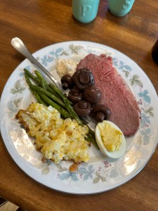 Prime rib with slow cooked mushrooms and horseradish, cheesy potatoes, deviled eggs and sautéed green beans. Yum! We also made an Easter Bunny veggie tray using a spinach bread bowl. So cute and fun. This was a family team effort! A couple items not showing in the picture are the homemade rolls from my Mother-in-Law along with the coconut cream pie that was melt in your mouth delicious.
