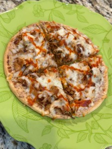 The chicken is slow cooked with some peanut butter tastiness. We like to toast the pitas some before adding any ingredients to them. I added a thin layer of peanut butter then the chicken and mozzarella cheese. I added siracha for some heat after finishing baking.