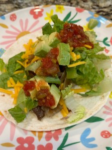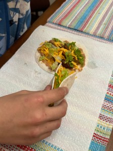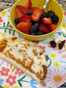 The oldest is disappointed we ran out of paper plates and is using a paper towel to save at least one dish. The girls made quesadillas with the pork.
