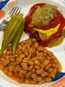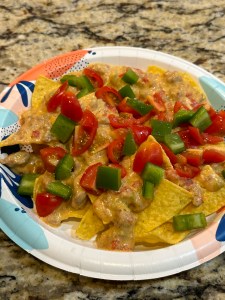 My husband made spicy sausage queso and the kids wanted to have corndogs and tater tots.