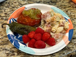 We brought home more homemade brats from our local grocery store for dinner and I wanted to try some of each flavor (italian sausage, philly and jalapeno/cheddar.) We also had bacon ranch pasta potato salad along with cornbread salad. While waiting for dinner we were snacking on a veggie tray (because all great parties new one!) and dips. All wonderful and so very yummy.