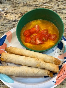 The oldest and youngest didn’t want taquitos and wanted frozen pizza so everyone got what they wanted. The green chili is from a local restaurant my husband and I love. Before jumping into making fresh freezer meals to help with the school year, I’m trying to go through and use up what we have stashed in the freezer already. This green chili was a special find. 🙂