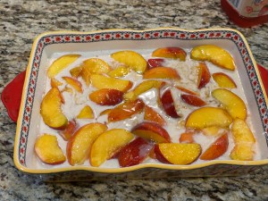 Gently stir together the peaches, sugar and strawberry juice and spread the slices on top of the bisquick combination.