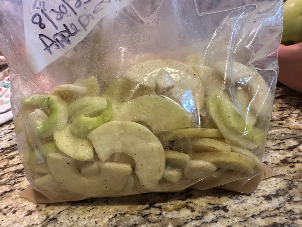 While slicing and preparing the apples, put the ones you are done with in a bowl of water with some lemon juice or fruit fresh to help the apples keep their color and not turn brown too quickly on you while you are still working on getting the other apples ready.