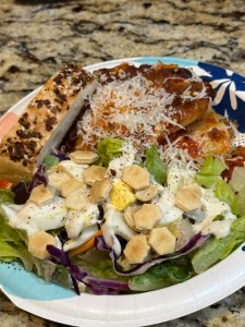 We had a frozen lasagna in the freezer and paired that with a salad and some sliced bread. I’m all about everything bagel seasoning so I bought a french loaf with that and a regular one too.