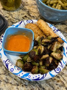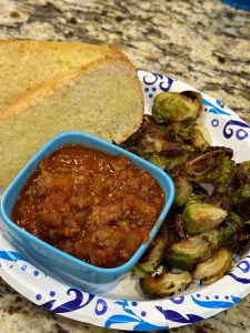 The kids love spaghetti and we had spaghetti today for dinner. I didn’t use pasta for mine and just toasted some bread to put some sauce on. So good! I love brussel sprouts and slow roasting them in the oven is my favorite. The kids had salad… I’m still hoping to have a brussel sprout lover pop up but it hasn’t happened yet.