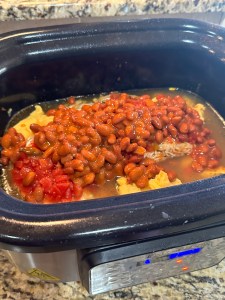 Go ahead and toss everything into the crockpot. We made this on Sunday after church when I knew I would be around for the afternoon and could stir from time to time. If that wasn’t the case, then I would cut up the velvetta and cream cheese into smaller cubes. Since we were using cooked chicken, we did this on low for 5ish hours and it was perfect.