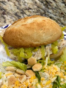 We haven’t had these for a while and we some had rolls on hand and frozen chicken uncooked chicken breasts to toss into the crockpot. Here’s a link to a similar recipe. On this day we used the crockpot instead of the instant pot and I added lots of pepperoncini peppers to mine.