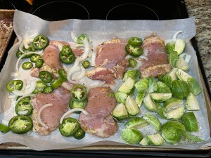 On one sheet pan we did boneless chicken thighs and sliced veggies. We baked this for 20 mins then flipped the chicken and veggies then baked another 15 mins.