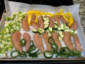 On the second sheet pan we did chicken tenders and sliced veggies. These were smaller so we baked them for 15 mins then flipped the chicken and veggies then baked another 5 mins.