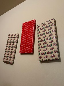 We have a picture set of three side-by-side pieces that I wrapped this year and love it! Usually the pictures hang vertically side-by-side and I tilted them once they were wrapped so they “felt” a little more like presents. It would be super cute to add some holiday ribbon for more flair and make them stand out as presents even more. The possibilities are as endless as the wrapping paper options!