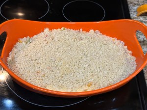 Melt the remaining 2 tablespoons of butter and stir in the panko until evenly coated. Spread evenly over the hominy mixture.