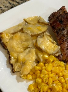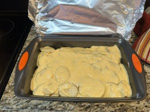 Layer into a 9×13 as follows: spray with pam, 1/2 the sliced potatoes, 1/2 the sauce, rest of the potatoes and the rest of the sauce.