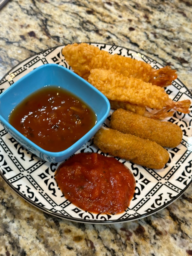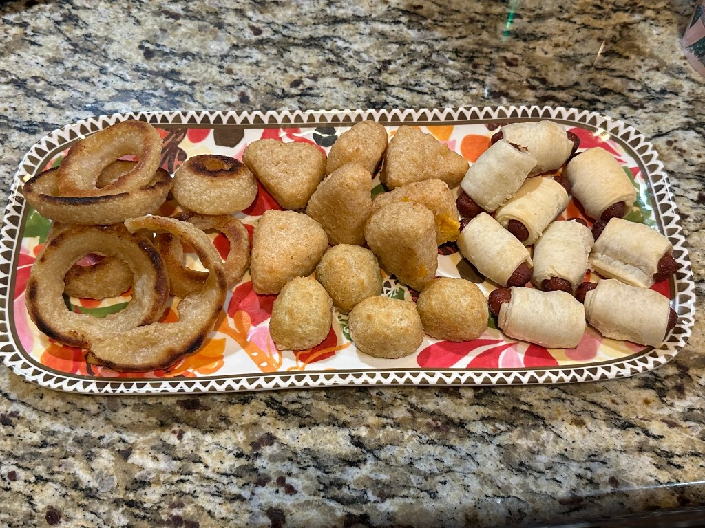 Onion rings, jalapeno poppers balls, mac and cheese balls and wrapped little smokies.