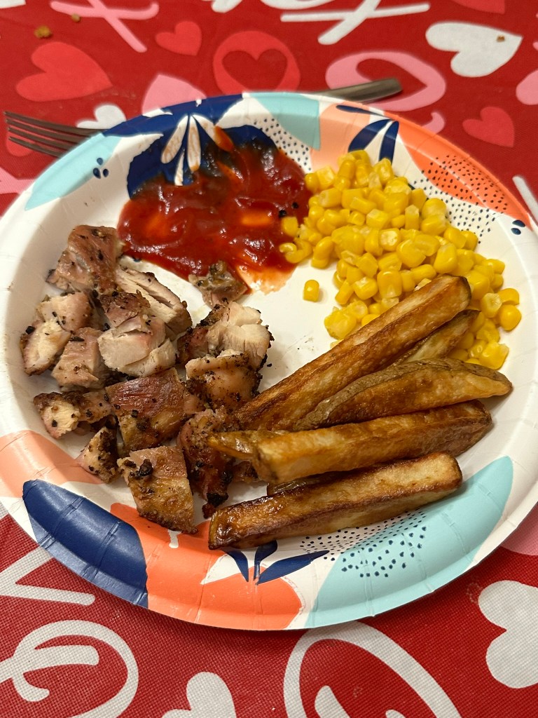 Here’s my daughter’s plate. We had grilled chicken thighs with homemade french fries and corn.