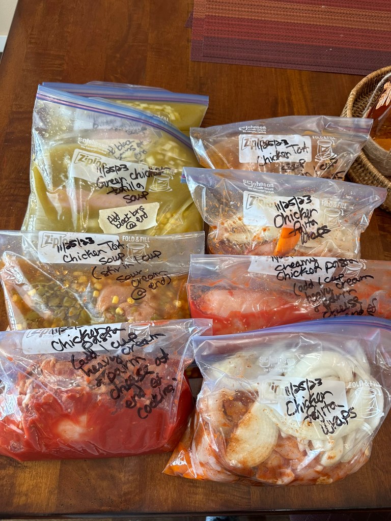 I made 34 meals on this day and 33 went into the freezer because I put one of the green enchilada soups into the crockpot that day as I was cooking. It had been a while since I made a big batch of freezer meals. I probably won’t do this many again at the same time.