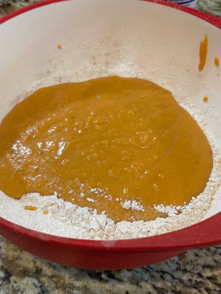 In a separate bowl, whisk together the egg, oil, pumpkin, both sugars and sour cream until combined. Add the wet ingredients to the dry ingredients and fold gently. Be careful not to overmix.