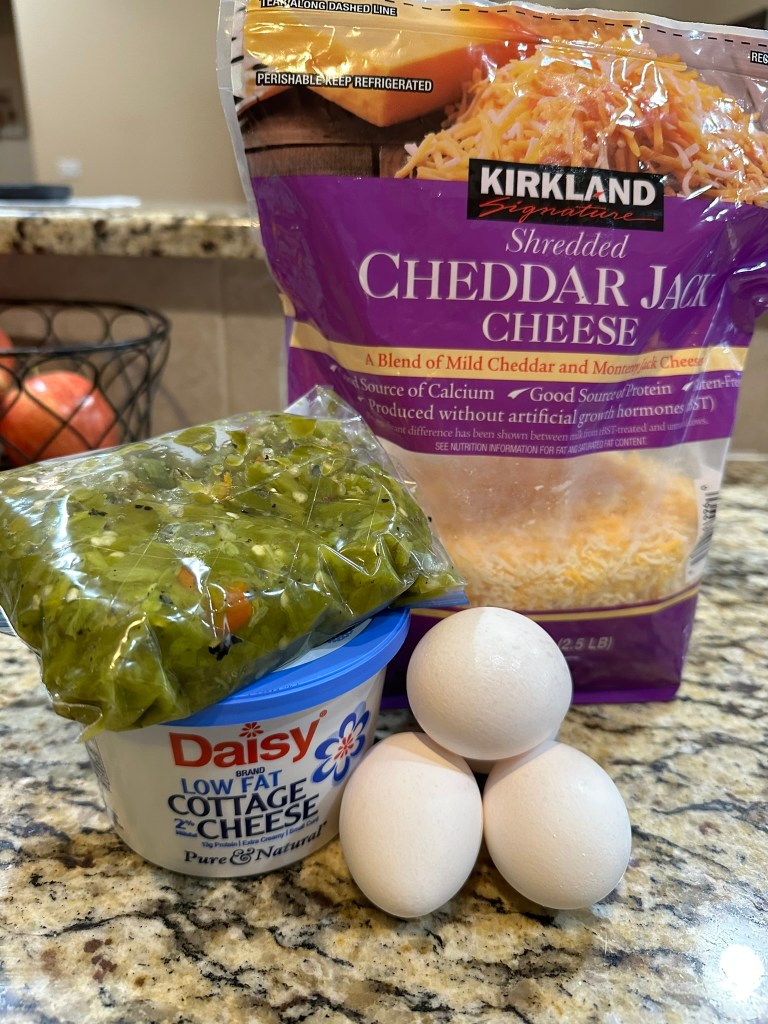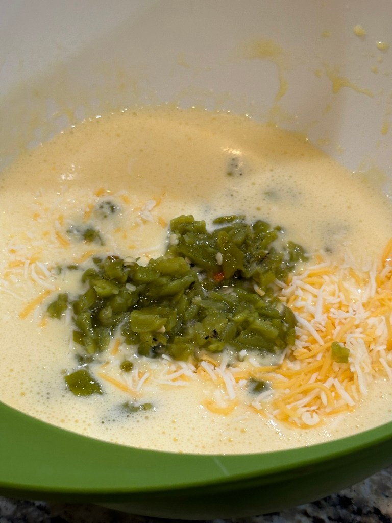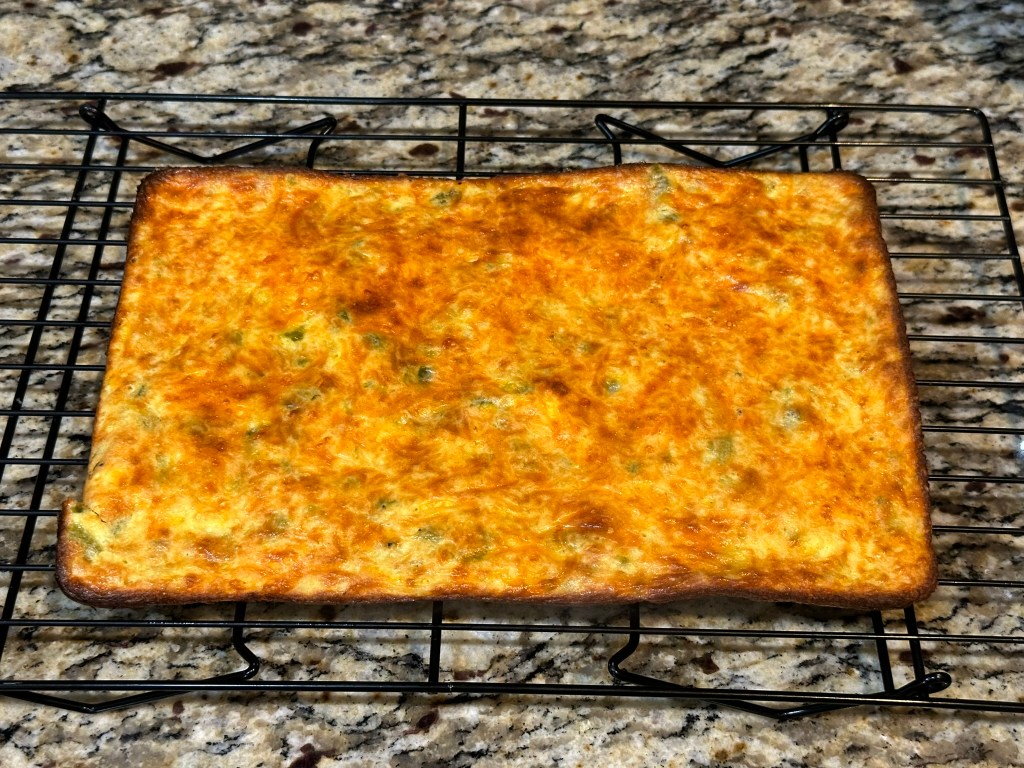 A few weeks ago we tried a recipe for low carb bread that used a combination of eggs and cottage cheese. This is a very similar recipe that adds in green chiles for flavor but it could just as easily be left out.