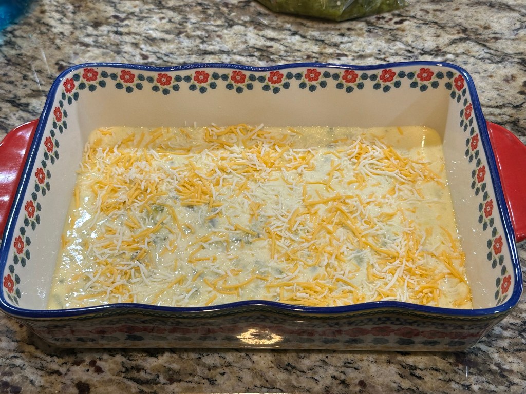 Use a blender for the eggs and cottage cheese and blend until smooth. Stir in the green chiles. Pour into a 9×13 baking dish sprayed with pam so it will come out easily and top with cheese.