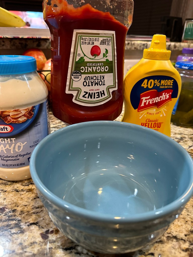 Whisk together equal parts of ketchup, mustard and mayo.