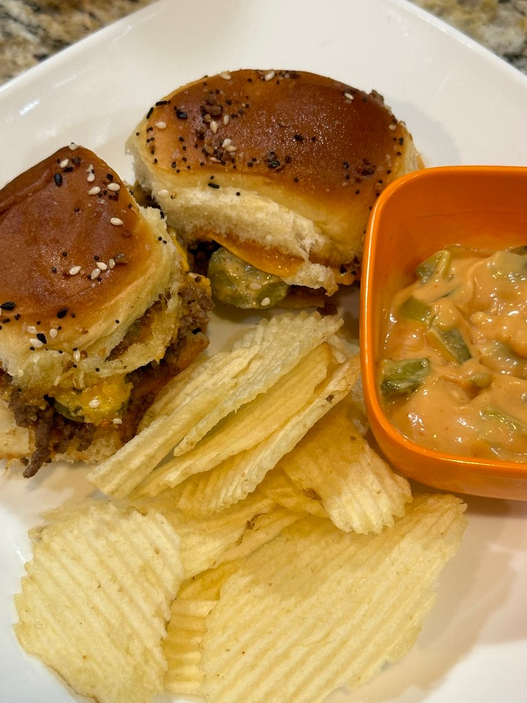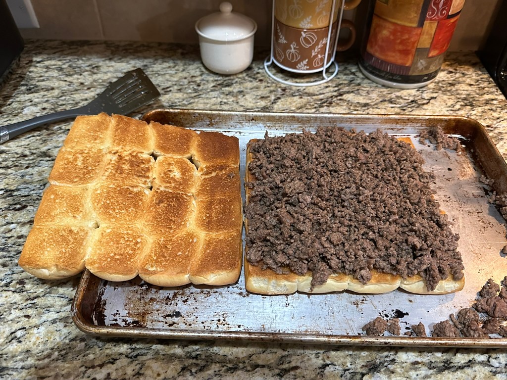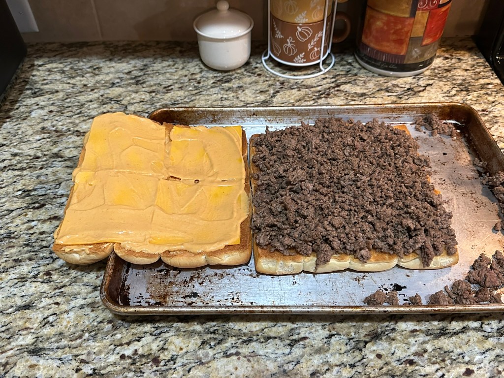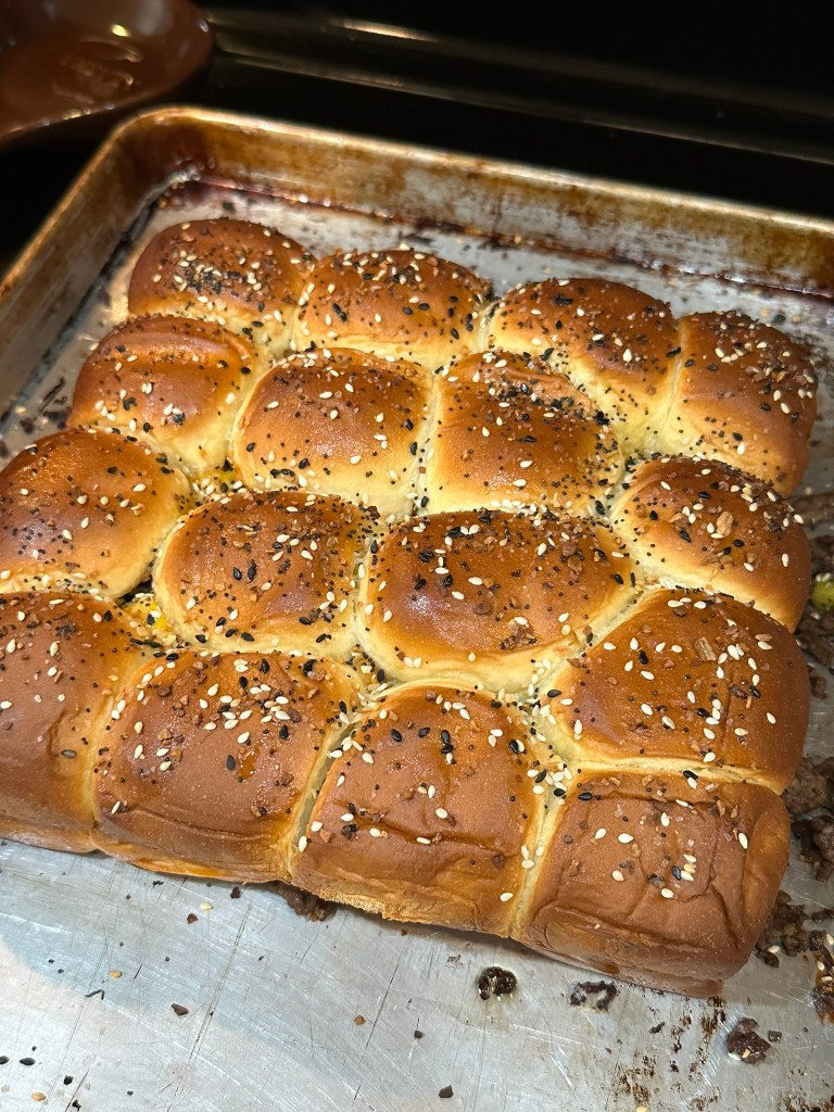 These are really good and using ground hamburger makes them easy to put together. Brushing the Hawaiian rolls with melted butter and sprinkling with everything bagel seasoning really takes these sliders to the next level.