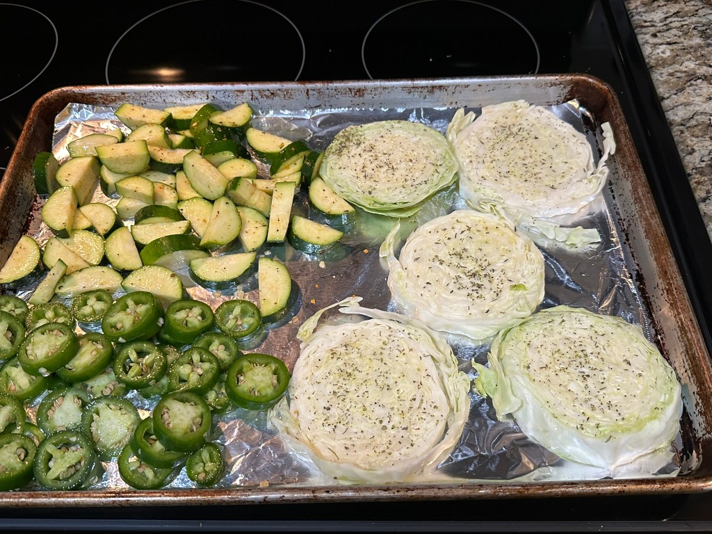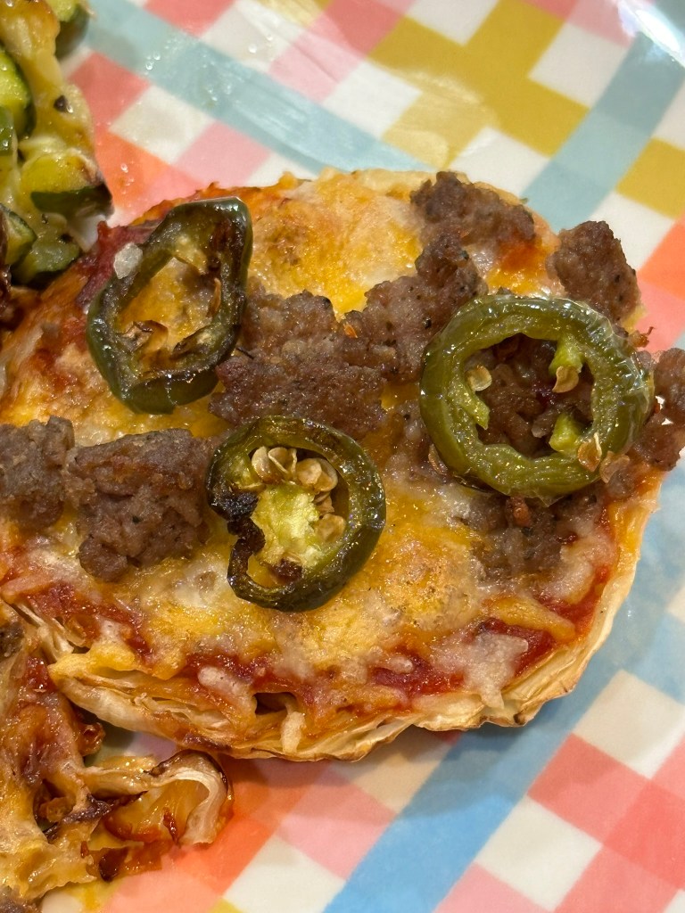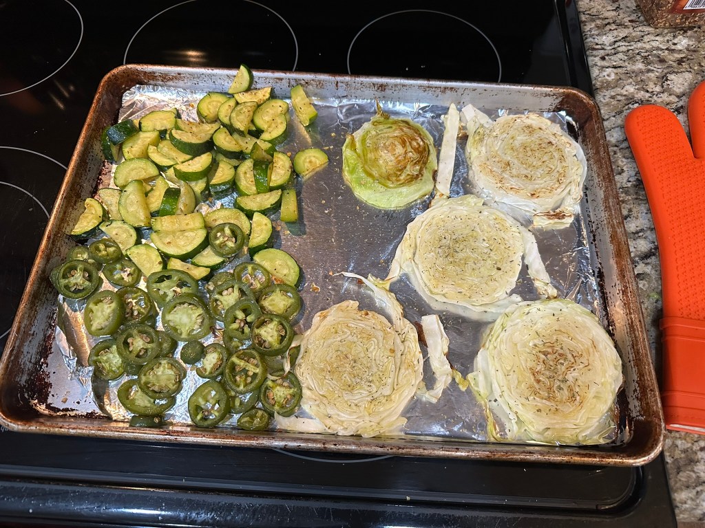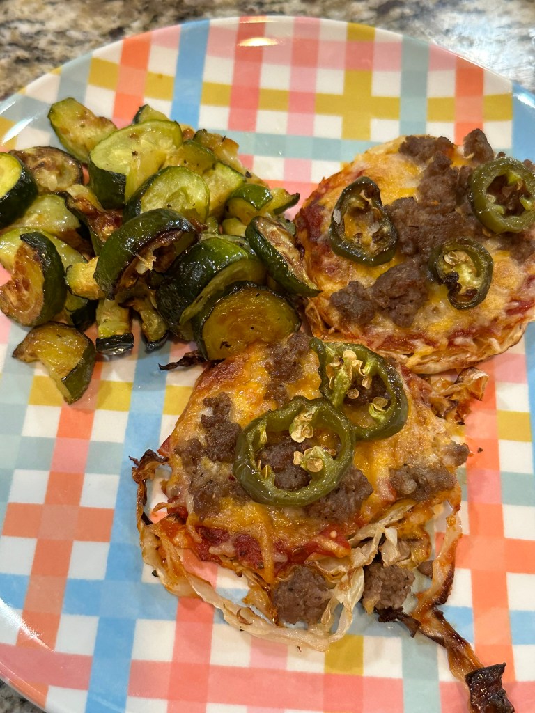 Once the cabbage is roasted how you want them, this is the point to add the toppings. I did ground sausage and jalapenos along with the pizza sauce and cheese blend.