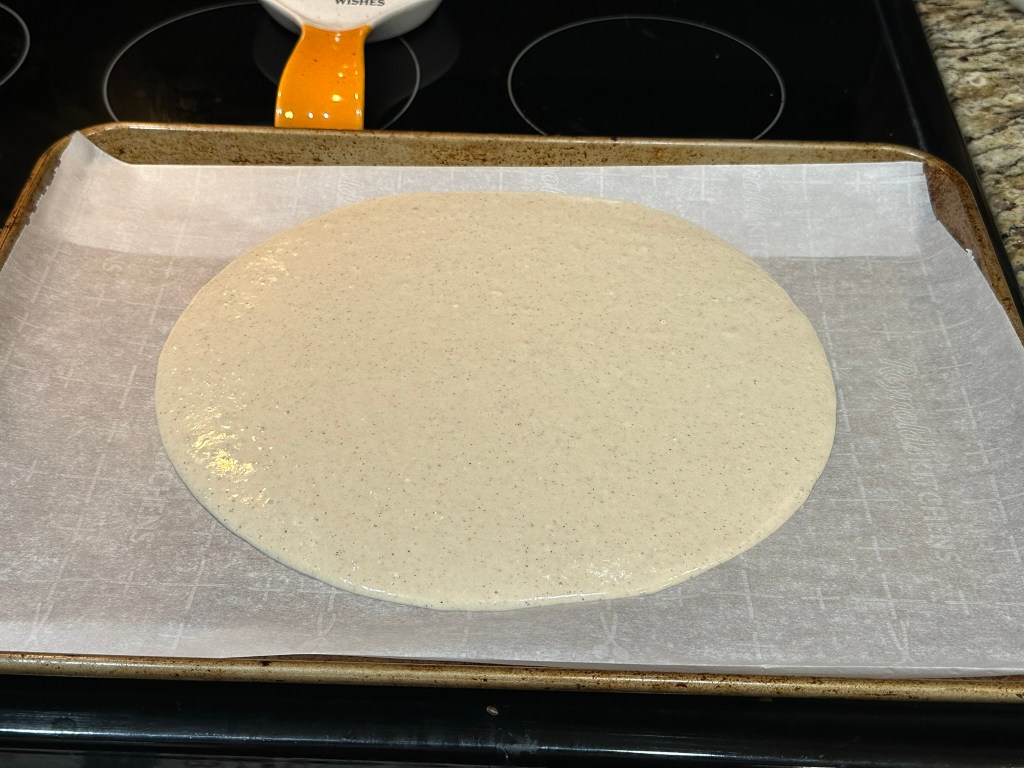 Pour the batter onto the parchment paper and spread out evenly.