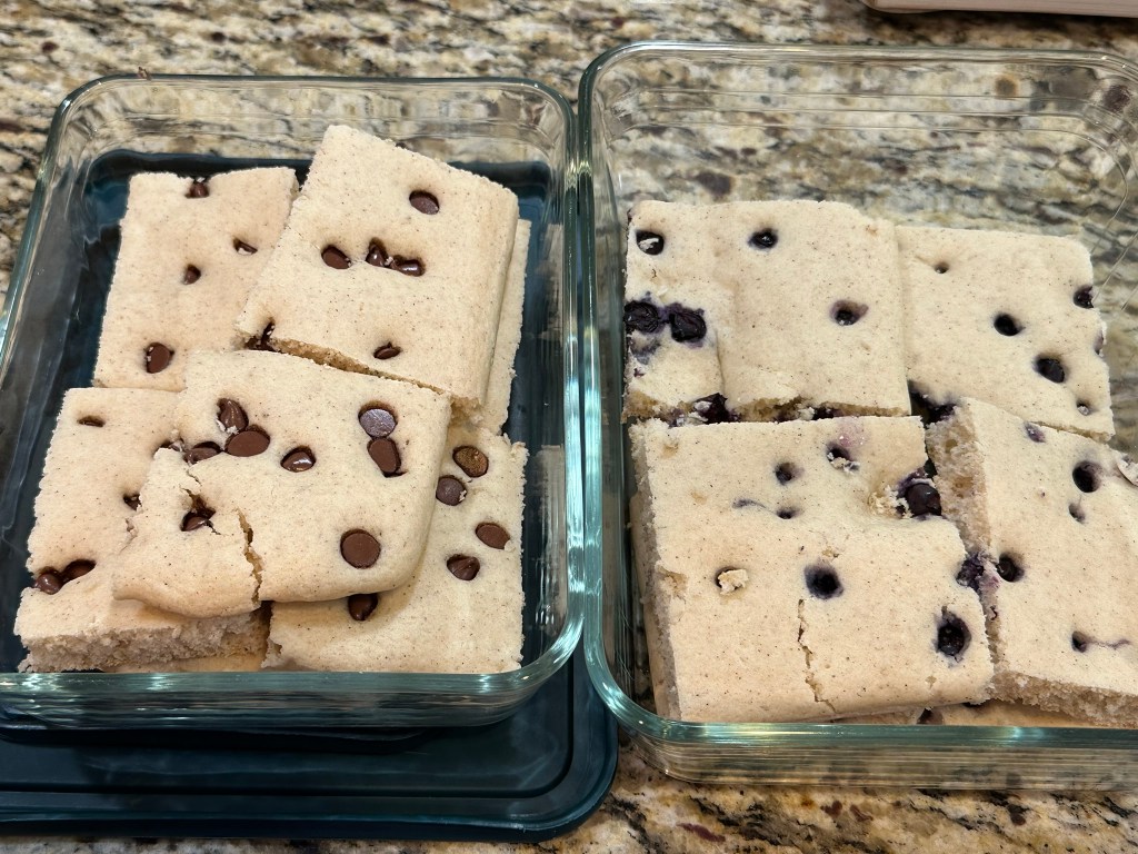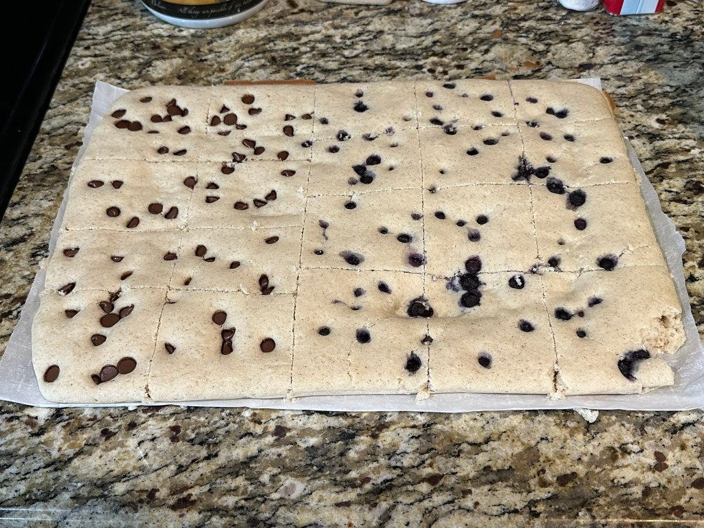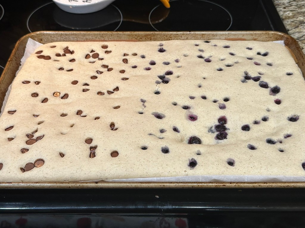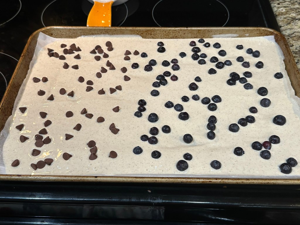 Sprinkle on the blueberries and chocolate chips. We did a half and half situation.