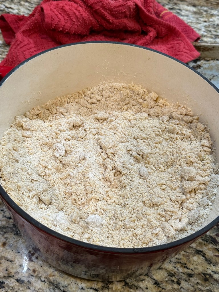 In a large bowl whisk together the flour, the rest of the white sugar and cinnamon, brown sugar, baking powder and salt. After whisked together – add in the eggs and combine. The mixture will be lumpy and not really like a “dough”. Spoon over the apples in the dutch oven.