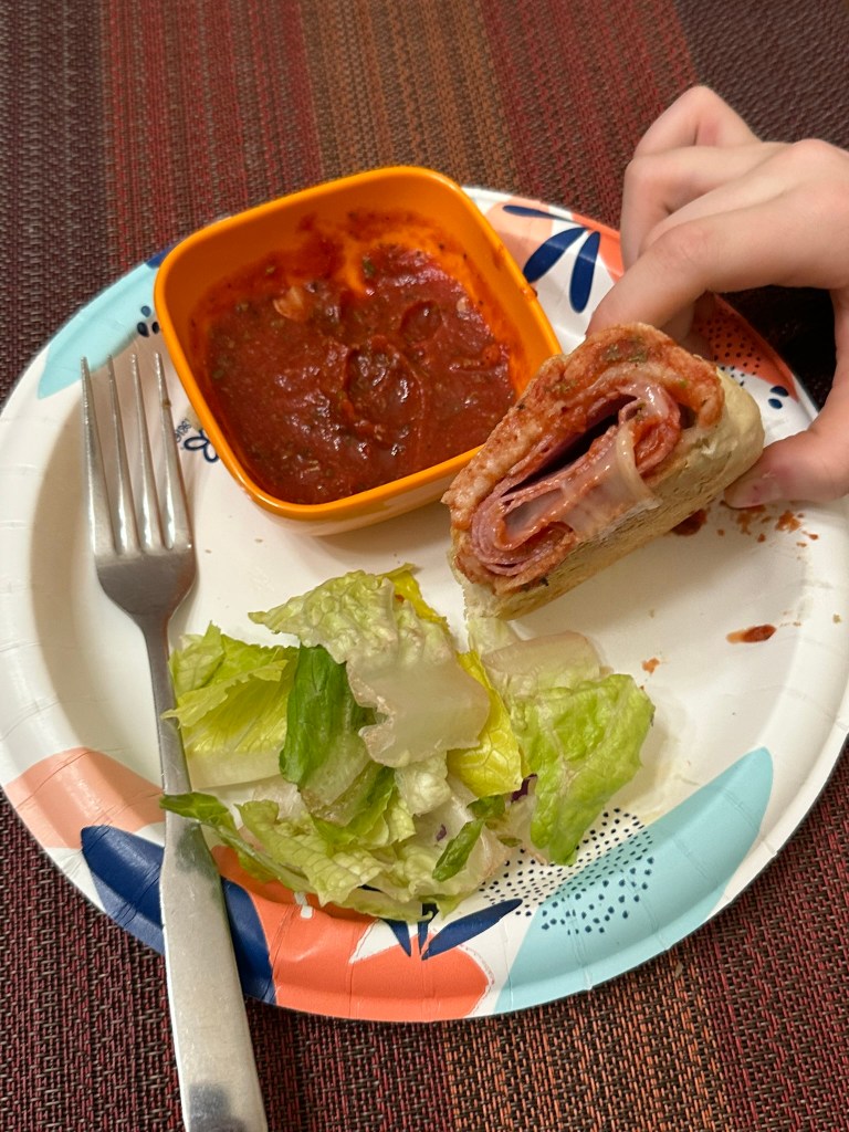 We couldn’t find the large pepperoni at the store and used several of the smaller pizza slices for each stromboli.
